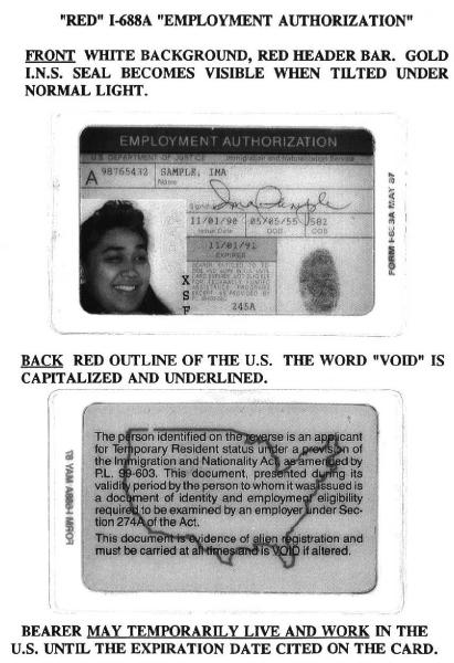 Non-citizens who apply and go through a preliminary interview for residency under the Immigration Reform and Control Act (legalization program) are first issued the I-688A. The card gives them the right to work in the U.S. When they are granted temporary residency, they are issued the I-688. |