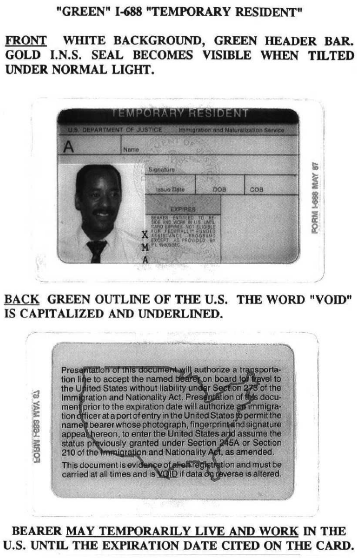 Non-citizens who apply and go through a preliminary interview for residency under the Immigration Reform and Control Act (legalization program) are first issued the I-688A. The card gives them the right to work in the U.S. When they are granted temporary residency, they are issued the I-688. |