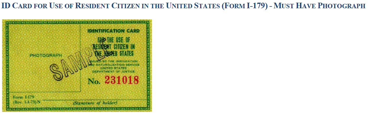| Identification Card for use of Resident Citizen in the United States I-179 Issued by the USCIS to U.S. citizens who are residents of the United States. The USCIS no longer issues this card. |